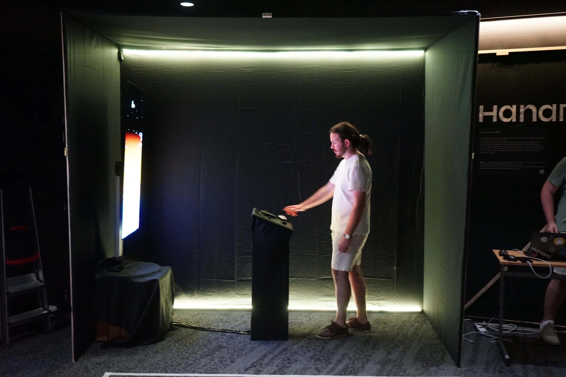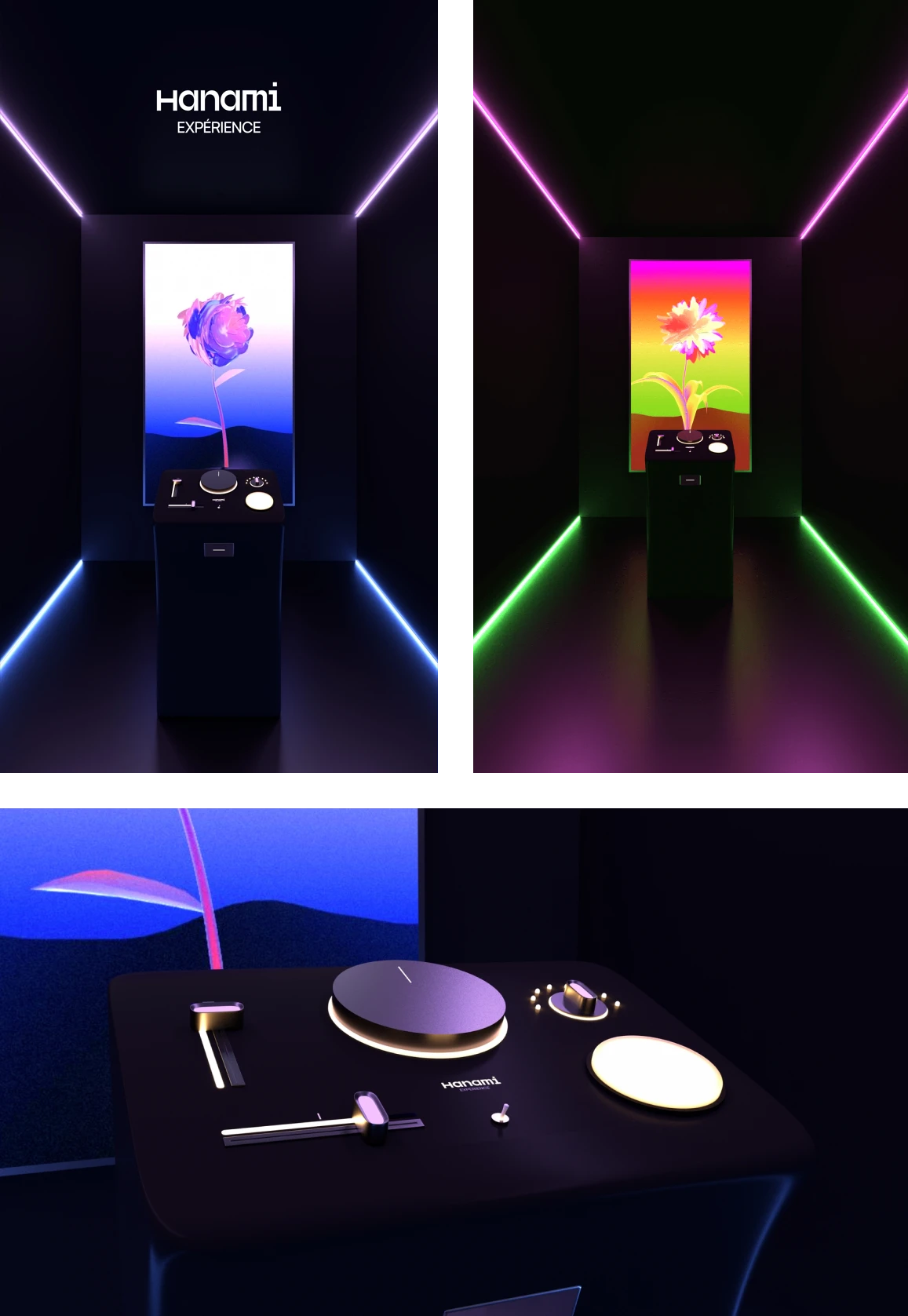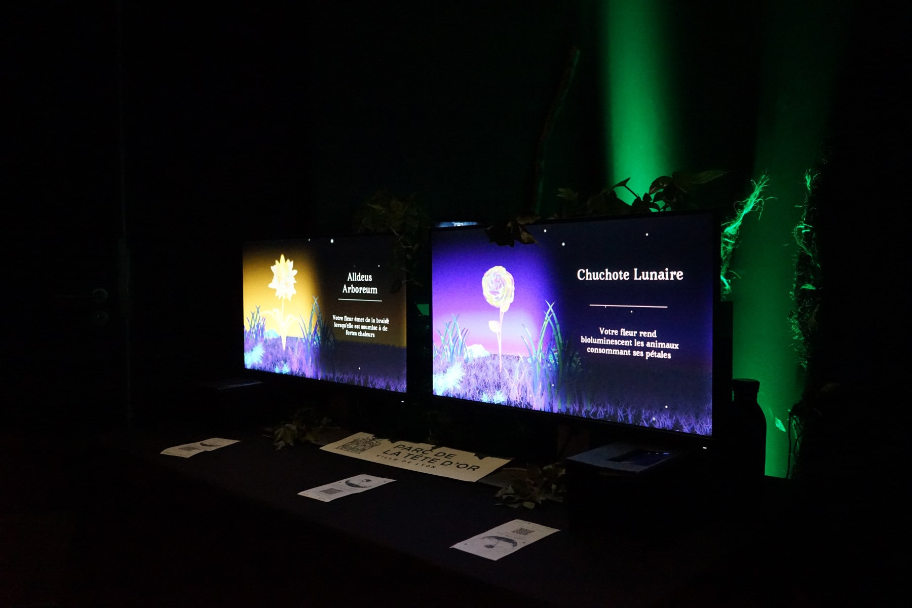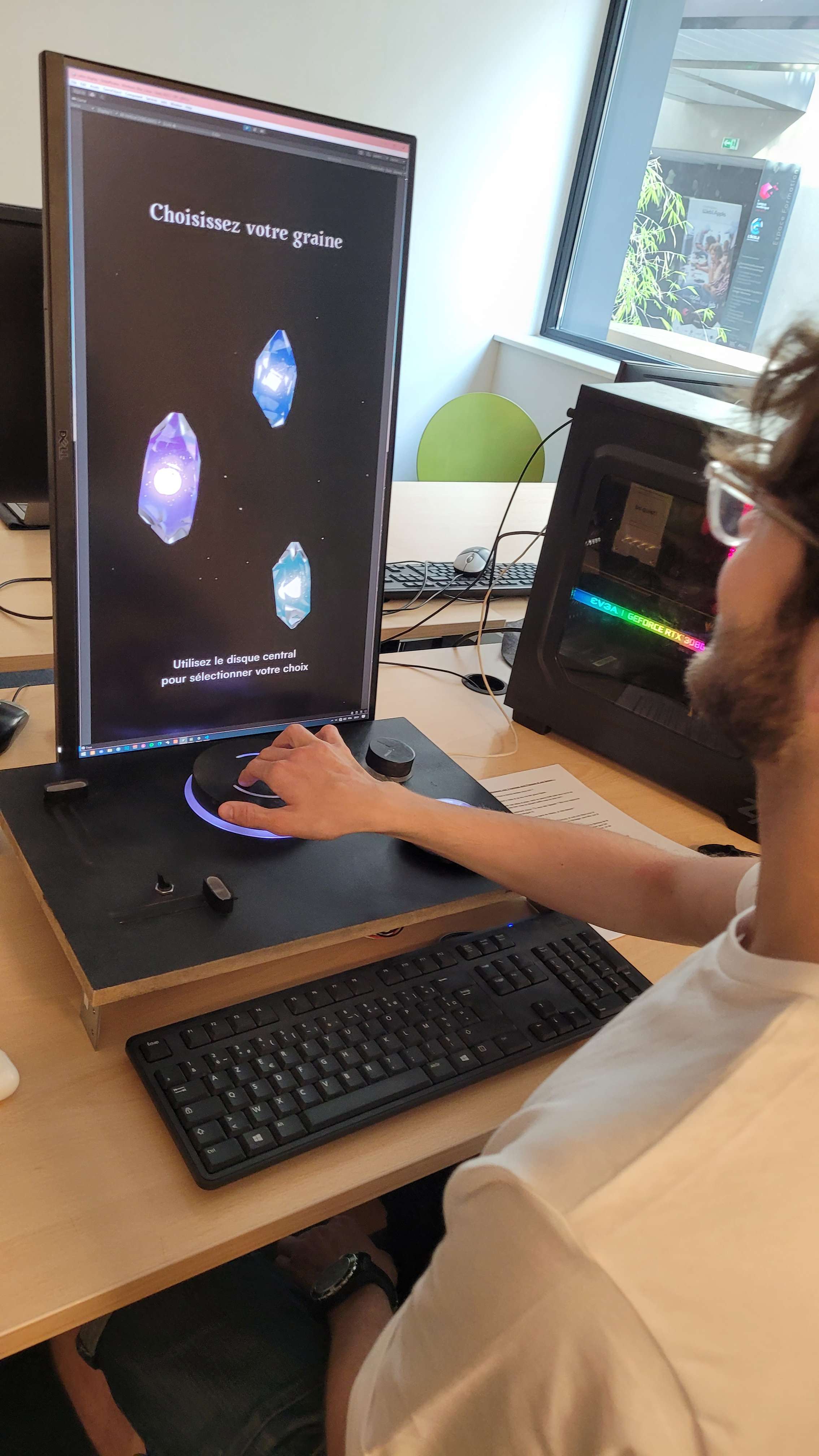 The scenography creates a universe in which the visitor is immersed with lights, sound, the opacity of the 6m² cabin and the screen presenting the history of his flower and the different choices he has to make.