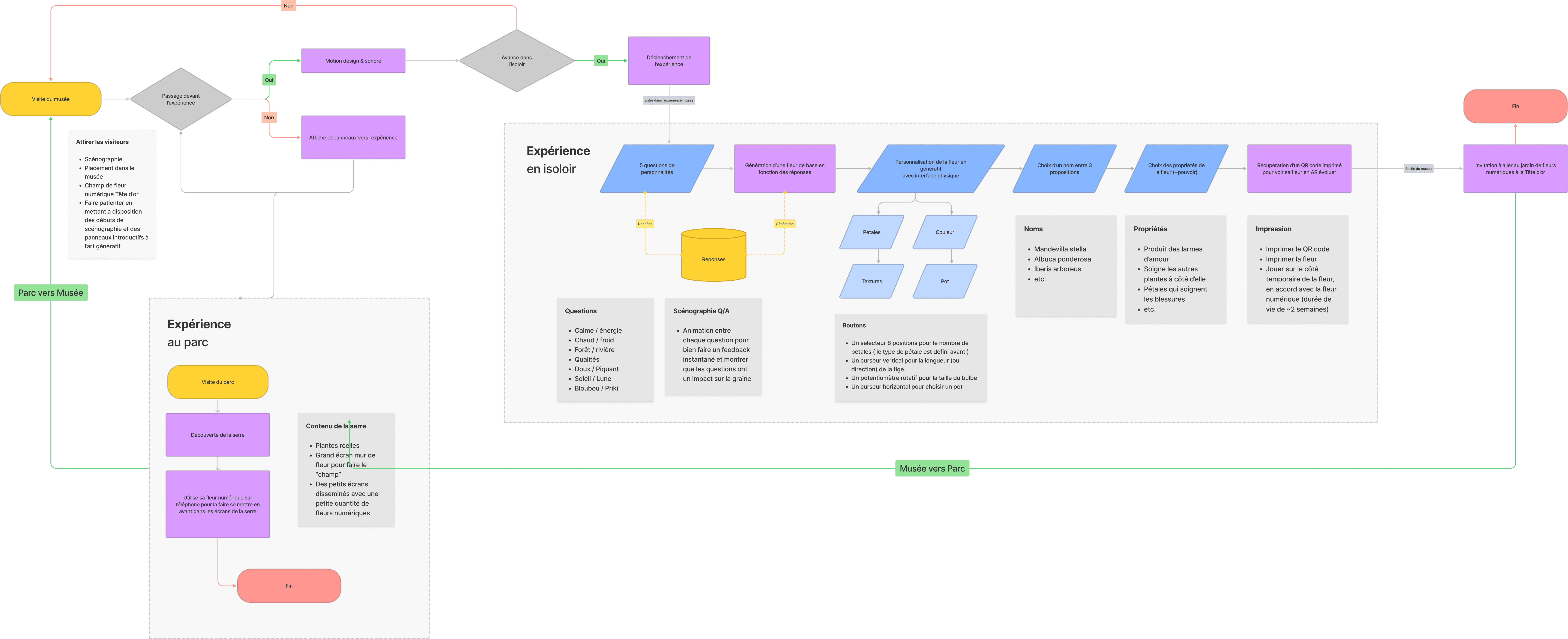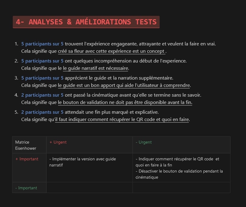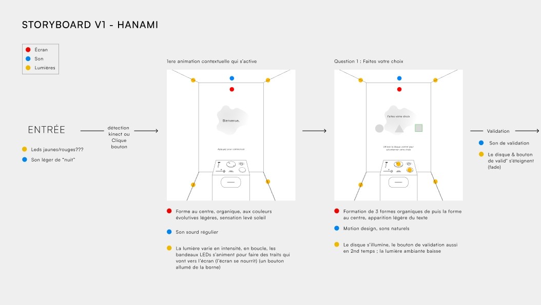 In fact, for each question on this prototype, I had drawn a rudimentary picture of a shoot that grew with each question. We can see here that it’s not necessarily the complexity of the action that gives the feeling of involvement that the testers confirmed, but rather the fact that you take an action that tells you afterwards that “you’ve just had an impact”. These elements will also have an impact on the environment, and from this observation we chose to reflect user’s choices in the scenography, i.e. the lighting, the evolving music, the voice-over, etc.
