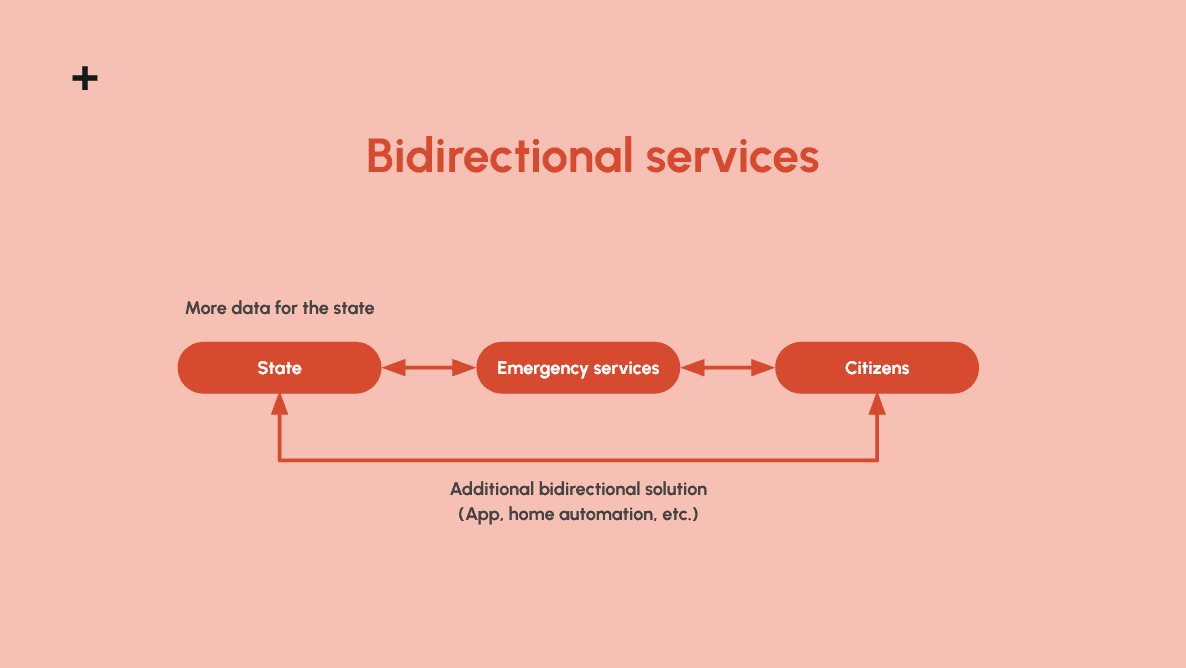 On the other hand, by enabling a bidirectional system (image on the right) via several devices (app, home automation, urban installations, etc.), crisis management becomes much more fluid.
