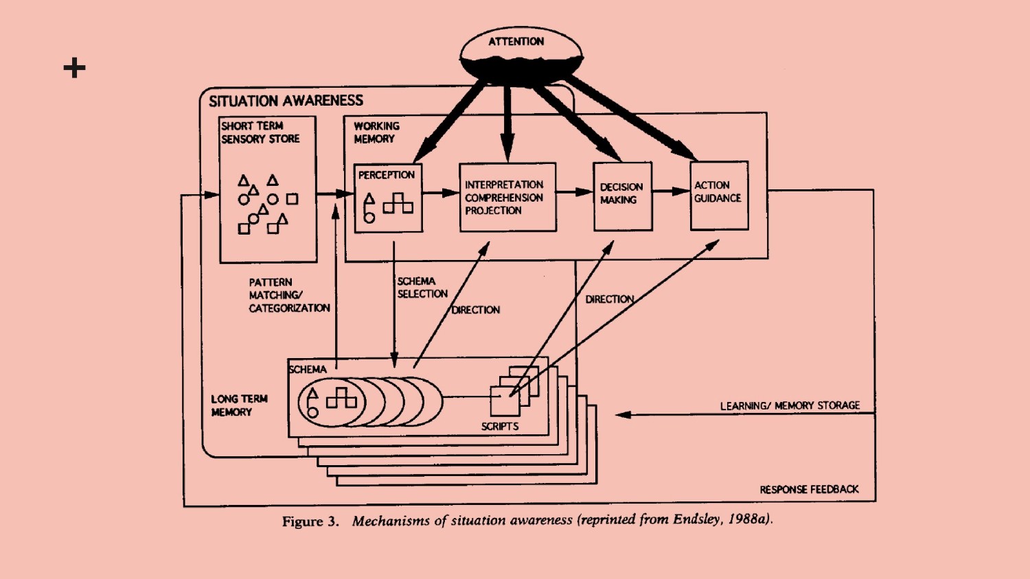 This diagram is taken from Endsley's thesis introducing the concept of "Situation Awarness". In this diagram from his research, which I highly recommend you read, he explains the concept of attention to sensory information, action scripts and feedback.